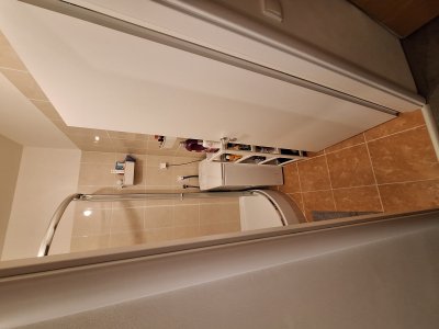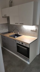 Kuchyně disponuje elektrickou troubou, včetně varné desky. Z chodby bytu je vstup na WC, které je odděleno od koupelny. Prostorný obývací pokoj o velikosti 27 m2 s vyšším stropem. Byt má vlastní plynový kotel.